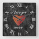 Wall clock with black and grey background with a heart in the centre. The words, "I love you more" are around heart.