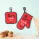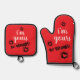 This fun kitchen duo reads, “i’m yours no refunds”. Designed with type, this oven mitt and pot holder will look good in your kitchen or at your next outdoor bbq.