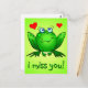 A cute green cartoon frog with red hearts, big googly blue eyes, for friends and loved ones - "i miss you!". You can change the text to any brief message you like, such as - thank you, i love you, call me, be hoppy!