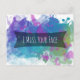 This bold, bright postcard is perfect for dropping a note to say hello when you can't visit in person. The background is covered in splashes of paints in shades of pink, purple, blue, teal and green. Over that is a partially-opaque black horizontal badge overlaying the centre. The message, "I Miss Your Face" is rendered in a modern, casual font. Both the message and the font can be changed to whatever you'd like it to say. Likewise, with the overlay and background separate, you might even choose to enlarge or re-position those elements too. Enjoy!