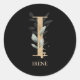 Letter I monogram floral. Letter I in golden brown texture accented with green watercolor compound leaves, flower blossoms and melted gold splashes. Personalized with name in matching font.