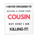 I Never Dreamed I'd Become A Super Cool Cousin But Here I Am Killing It design. This is a short funny quote which is great as an appreciation gift idea for Cousins. Also suitable as Cousin gifts for Christmas or Birthday.
