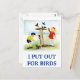 A whimsical image of children feeding birds, and even enjoying the company of a hungry squirrel. Caption reads I PUT OUT FOR BIRDS. A cute card for bird lovers that put out.