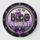 This quirky circular illustration features a stylized black spider with large, expressive eyes and a glittery purple flower. The spider is surrounded by pearls, a black bow, and a spiderweb. The text "I Put the Boo in Boujee" is written in a bold, spooky font, giving the art a fun, Halloween-themed, and luxurious feel.