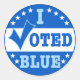 Here's a sticker for Democrats for Election Day and after (and before if you voted early). It features a blue circle bordered with white stars and containing the words "I VOTED BLUE" The "v" in "vote" is a blue checkmark.