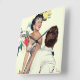 Artist:Joe DeMers | Woman in a zebra striped dress and red flower pin leaning over in a chair talking to a man in a white suit