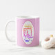 This mug expresses the message of Bible verse 7:7 of waiting, trusting and watching for the Lord's answer to prayer. On one side it depicts a comic by Christina Swanson of a young lady at the window watching with an excerpt from the verse and the complete verse on the other side.