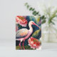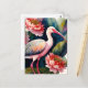 Postcard features an ibis in a floral botanical watercolor portrait with oversized coral-pink flowers and leaves.