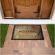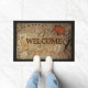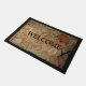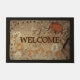 A welcome mat for your man cave. Painted hand prints and a woolly mammoth as you might find in the interior of a cave. Text reading, "WELCOME" also appears. You may change the background colour.