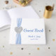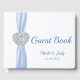 Elegant diamond heart with a ice blue ribbon decorate this guestbook. Wedding guest books are fun for both the couple and their celebrants. Invite attendees to leave you well-wishes at your reception, and you're guaranteed to have a keepsake to look back on for years to come. Plus, your guests will get to leave their mark on your event, not to mention put in writing whatever they didn't have a chance to express in person on the big day. Personalize the book by changing the text in the fields provided. You can change font style, size, and colour.