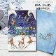 This hand-painted card features a flying fairy bringing a new baby to a whimsical village filled with "fancy" blue houses, friendly forest animals, and a cheerful snowman.