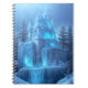 Notebook of a magical castle made entirely of ice. A frozen waterfall descends from the keep's foundations to become icicles at its end. Pine trees flank the castle as the Sun refracts through the ice creating beautiful blue lights that seem to come from the heart of the keep... maybe the frozen dreams trying to break free. The image was generated with Leonardo.ai and altered by me.