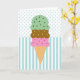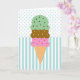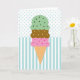 This design features a triple scoop ice cream cone (strawberry, chocolate white chocolate chip and mint chocolate chip) on a light blue polka dot and striped background. Customize this card for party invitations, note cards or anything you'd like!