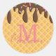 These custom sticker labels feature a yummy looking ice cream cone design. The background is waffle cone pattern. Brown chocolate frosting drips with rainbow sprinkles is dripping from the top. A sample initial and name are printed below the icing which you can personalize to include your own name, or other custom text.