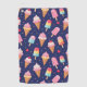 Pattern on blue background with creamy ice cream and popsicles, cherries and confetti floating around. Cute whimsical food design.