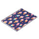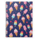 Pattern on blue background with creamy ice cream and popsicles, cherries and confetti floating around. Cute whimsical food design.