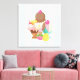 Gallery wrap canvas illustrated with a bowl of ice cream with 3 delicious scoops covered in candy sprinkles. An ice cream cone also with 3 scoops of chocolate, vanilla and strawberry. A dessert bowl filled with neopolitan flavoued ice cream with a delicious cherry on top. A green and white stripes pattern in the background.