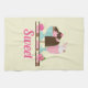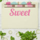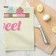 Kitchen towel with the word: Sweet (can be changed). Asweet ice cream theme. Illustrated with a chocolate ice cream bar, 3-scoop sundae with a cherry on top, and a strawberry float with whipped cream dollops on top. Little strawberries and cherries along the bottom. Yellow background colour.