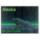 A peaceful moment in the long Arctic night. A Polar Bear rests at the edge of an open area in the pack ice. The Northern Lights glow in the distance; bright stars twinkle overhead. Text reading "Alaska" appears in glowing green and white. Customize b adding your own additional text.