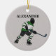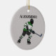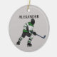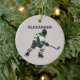 Hockey Player Personalized Ornament in green is for the ice hockey player in your life! A large hand-drawn hockey player motif sourced from my photography of a Junior hockey player from my city! Personalize and customize this ornament for the perfect gift for your hockey player or fan.