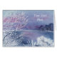 A watercolor landscape of a winter pond with surrounding foliage frosted with ice adorns this card. Customize by changing the text to suit yourself!