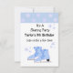 A fun birthday skating party invitation. A pair of blue skates with little snowflakes falling down around them. A top border of blue with white polka dots.