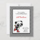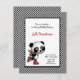 A fun invitation for any skating party. it features a black and white checked border around the invitation. A picture of a black and white panda with red ice skates sits at the bottom. The text is done in coordinating black and red and is completely customizable.