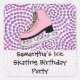 Cute pink ice skate with pink and purple swirl background. Perfect for the little girl's ice skating birthday party or other event on the ice. Copyright © www.CustomInvitesOnline.com