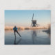 Postcard of an athlete ice skating on a frozen river past hoar-frosted reeds and a windmill on a beautiful winter morning in the Netherlands.