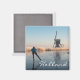 Souvenir photo magnet with an athlete ice skating on a frozen river past hoar-frosted reeds and a windmill on a beautiful winter morning in the Netherlands with the text: 'Holland'.