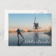 Postcard of an athlete ice skating on a frozen river past hoar-frosted reeds and a windmill on a beautiful winter morning in the Netherlands with the text: 'Netherlands'.