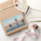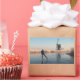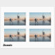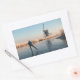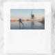 Rectangular photo sticker of an athlete ice skating on a frozen river past hoar-frosted reeds and a windmill on a beautiful winter morning in the Netherlands.