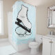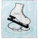 A white ice skate on a blue and white background with an area you can personalize with a name before ordering, or leave blank for an non-personalized shower curtain.