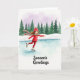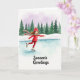 On this holiday card, a pretty girl glides on ice, dressed in red and green. She wears a striped hat and scarf, and the scene looks dreamy and calm, with pine trees and snow. The sky is a soft pink and the girl is skates with joy. At the bottom, in fancy letters, it says "Season's Greetings." This card brings warmth and cheer to all who see it, perfect for spreading holiday joy! 🎅🏼🎄🎁