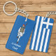 Icône de la Garde Evzone grecque (tsolias) tenant un fusil, portant fès rouge, fustanella et tsarouchia. Couleur arrière - plan personnalisée. Texte personnalisé. Drapeau de la Grèce à l'arrière.