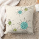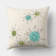 This Iconic Atomic Starbursts Throw Pillow (large print) pattern features iconic atomic starbursts. That’s right! The old school, cream coloured background with gold speckles is the perfect backdrop for the vibrant turquoise, soothing celery, and kitschy pear green coloured circles. The spots of colour are sporadically placed in various sizes with overlaying black V shaped lines to form the mod sputnik starbursts. Styled after a 1950’s dish pattern, this retro inspired design has everything you need to be truly mid century modern.