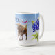 Unique mug design featuring the Bluebonnet flowers of Texas and a Texas Longhorn on light blue. The Bluebonnet flower is the state flower of Texas. In March and April, these beautiful flowers bloom in fields and freeway medians.