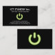A cool plain ICT business card with a elegant green glowing Standby or "on and off" symbol on a dark light trail background.