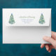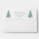 Envelope design with a light blues / greens / white check liner and the name / address flanked by a watercolor Christmas tree decorated in a blue and white theme. These watercolor elements were handpainted by me. I have invitations, holiday cards, gift tags and other items that match these envelopes.