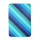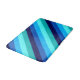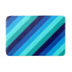 A medium sized bath mat featuring a cool pattern design of diagonal stripes in navy blue, cobalt blue, sky blue, icy mint teal, and light turquoise.