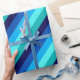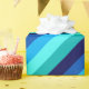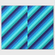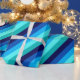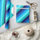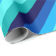 A roll of wrapping paper featuring a cool pattern design of diagonal stripes in navy blue, cobalt blue, sky blue, icy mint teal, and light turquoise.