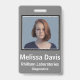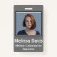 badge d'identification de l'employé dans la conception verticale classique. Arrière - plan gris acier. Tous les éléments sont modifiables ou amovibles. Les éléments comprennent : photo de l'employé, nom de l'employé, nom de l'entreprise, service de l'employé. Le dos de la conception a la sécurité code barre numérisation. Assieds-toi au sommet pour le lanyard.