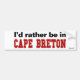 I'd Rather Be In Cape Breton! Are you from Cape Breton, Canada? Do you have a friend or family member who loves Cape Breton, Canada? If so, this "I'd Rather Be In..." bumper sticker is what you're looking for! The design features "I'd rather be in" in small black lettering at the top and "Cape Breton" in big red lettering at the bottom.