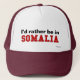 I'd Rather Be In Somalia! Are you from Somalia? Do you have a friend or family member who loves Somalia? If so, this "I'd Rather Be In..." hat is what you're looking for! The design features "I'd rather be in" in small black lettering at the top and "Somalia" in big red lettering at the bottom.