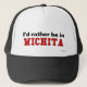 I'd Rather Be In Wichita! Are you from Wichita, Kansas? Do you have a friend or family member who loves Wichita, Kansas? If so, this "I'd Rather Be In..." hat is what you're looking for! The design features "I'd rather be in" in small black lettering at the top and "Wichita" in big red lettering at the bottom.