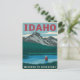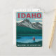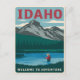 A vintage-style travel poster depicting a person fly fishing in a serene lake surrounded by mountains and trees in Idaho. The poster reads Welcome to Adventure.