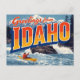 This adventurous retro-style design features the classic "Greetings from IDAHO" typography set against a rugged mountain and river landscape. The scene showcases the state's incredible outdoor recreation, with a kayaker navigating powerful whitewater rapids, set against snow-capped peaks and pine forests. Perfect for fans of vintage travel posters, retro artwork, extreme sports, the Rocky Mountains, and the wilderness of the Gem State. This is an ideal souvenir or gift for outdoor enthusiasts and Idaho fans.
