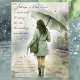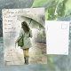 Spring inspired postcard featuring a watercolor illustration of a woman walking down a paved path on a rainy day. She is seen from behind, wearing a light-coloured coat, knee-high boots, and carrying a bag over her shoulder. She holds an umbrella above her head, shielding herself from the rain. The background is misty and blurred, with greenery and stone walls visible along the path. A quote from author Jennifer Rush -