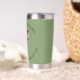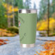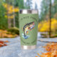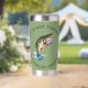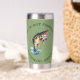 This fun insulated tumbler is just perfect for the avid fisherman! It has an illustration of a fish splashing in the water and it says If I'm not fishing, I'm thinking about it. Background is a dark olive green.