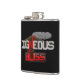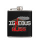This geology humour hip flask features the pun "Igneous is Bliss," a geology spin on the common phrase "Ignorance is Bliss." The letters are drawn as grey rock and red, crystal-bearing magma mush below an active, erupting volcano.